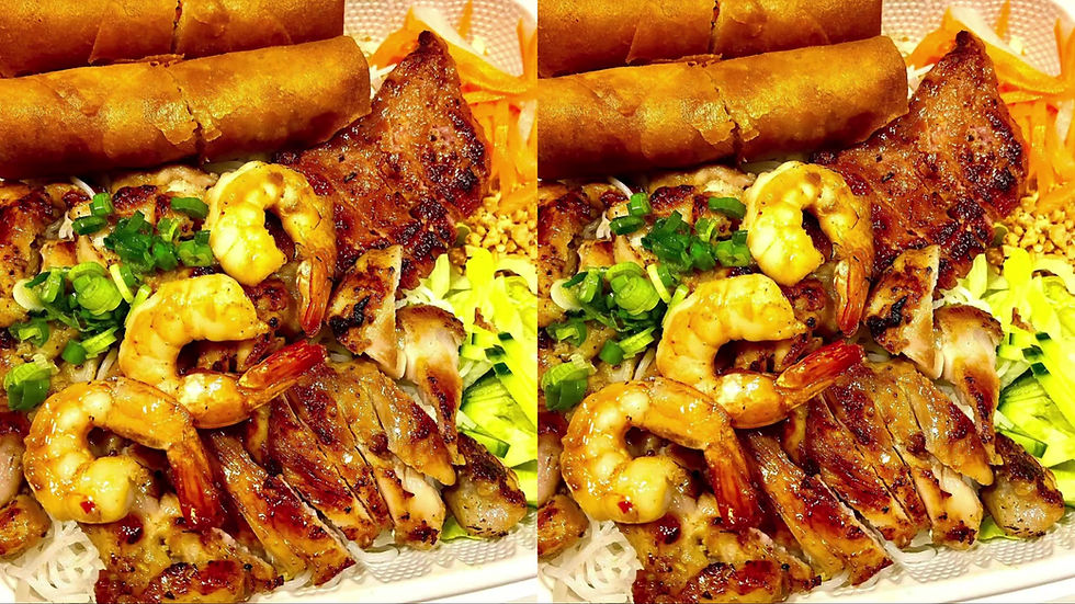 Indulge in our Happy Special, featuring a delightful mix of grilled lemongrass chicken or pork, a savory pork patty, crispy spring rolls, and succulent tiger prawns. This mouth watering dish is topped with fresh diced green onions and served alongside fragrant Jasmine Rice or Vermicelli. Don't miss out on this must-try culinary experience!